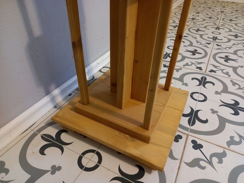 Starý květinový stolek po renovaci. Je olouhovaný, obroušený a zatím bez povrchové úpravy čisté dřevo. Rozměry v. 105 cm.