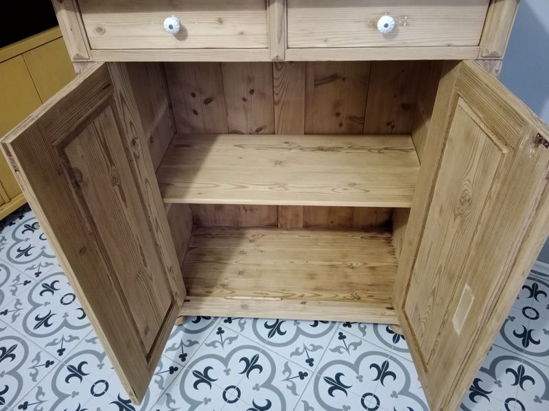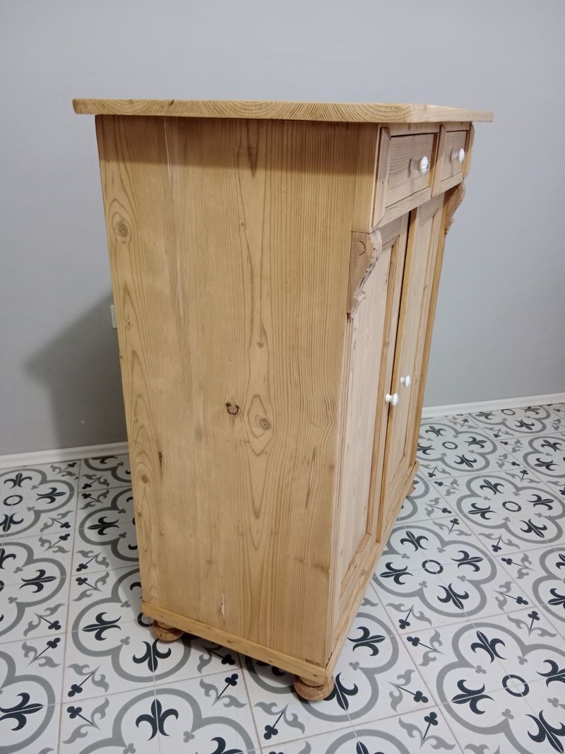 Stará skříňka po renovaci . Je olouhovaná , obroušená a zatím bez povrchové úpravy čisté dřevo.