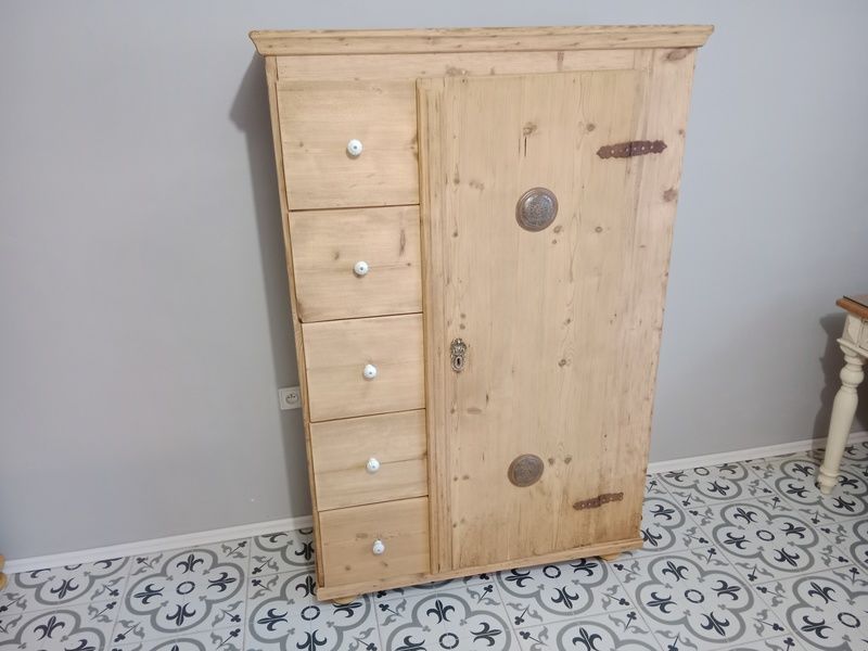 Stará vařenka po renovaci . Je olouhovaná , obroušená a zatím bez povrchové úpravy čisté dřevo. Rozměry v. 168 cm , š. 111 cm , h. 40 cm .