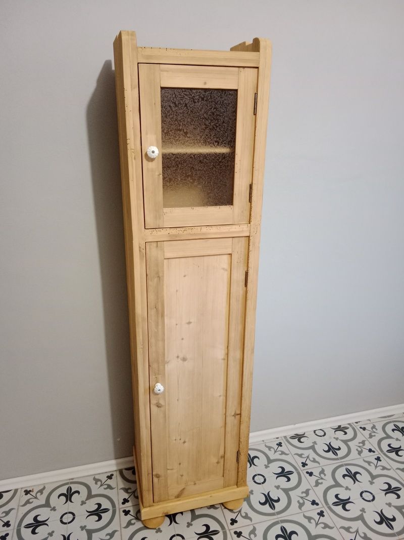 Stará skříňka po renovaci. Je olouhovaná, obroušená a zatím bez povrchové úpravy čisté dřevo. Rozměr v. 170 cm, š. 42 cm * h. 34 cm.