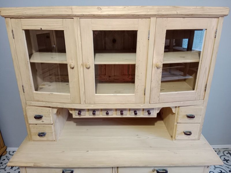 Stará kredenc po renovaci. Kredenc je olouhovaná, obroušená a zatím bez povrchové úpravy čisté dřevo. Skládá se ze dvou samostatných kusů.