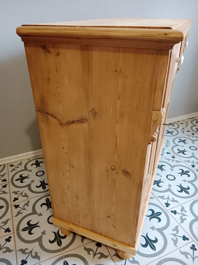 Stará skříňka po renovaci. Je olouhovaná, obroušená a zatím bez povrchové úpravy čisté dřevo. Rozměry v. 94 cm, deska 99 * 44 cm.