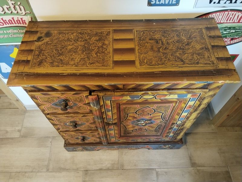Krásná, stará, malovaná vařenka. Originál z roku cca 1870. Na svůj věk v pěkném stavu. Rozměr v. 105 cm, š. 99 cm, h. 41 cm.