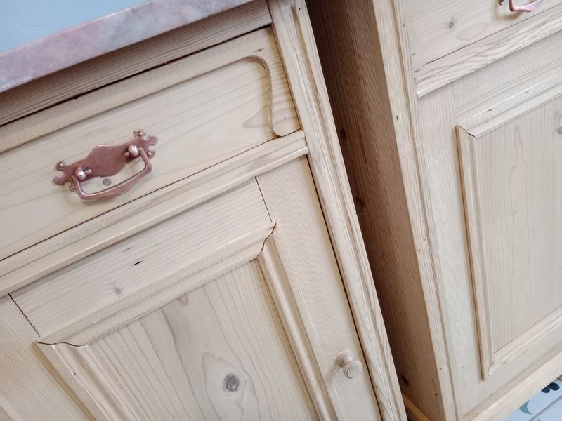 Staré noční stolky po renovaci 2 ks. Jsou olouhované, obroušené a zatím bez povrchové úpravy čisté dřevo. Rozměry: výška 80 cm, deska š. 43 cm * h. 37 cm . Desky jsou původní mramorové, mohu vyměnit a dřevěné. Cena za pár 7 500,-.