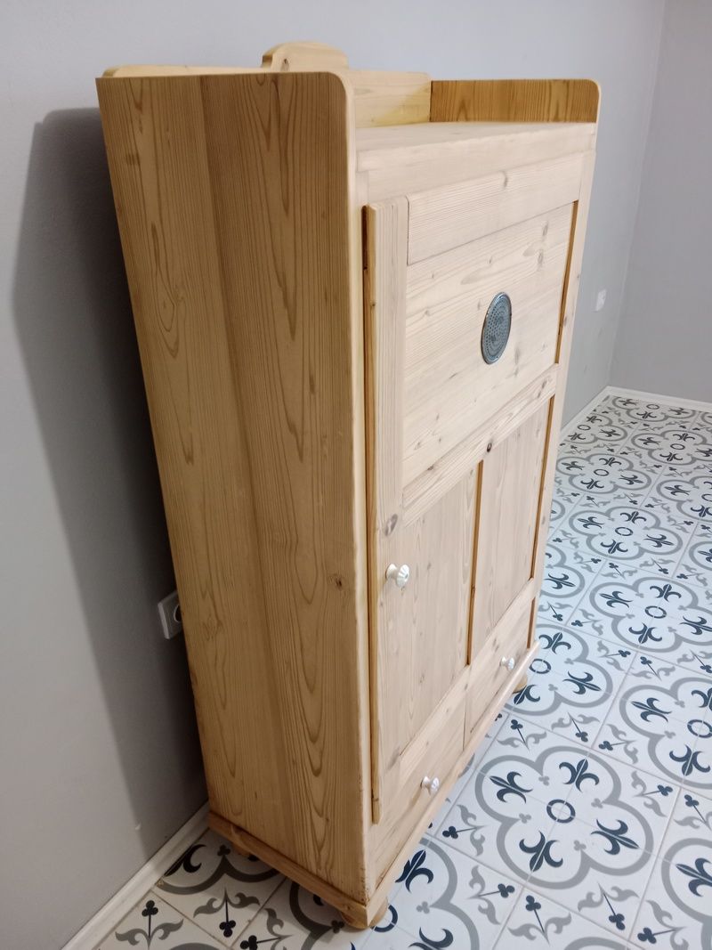 Stará skříňka po renovaci . Je olouhovaná , obroušená a zatím bez povrchové úpravy čisté dřevo. Rozměry výška 144 cm , šířka 83 cm * hloubka 37 cm.