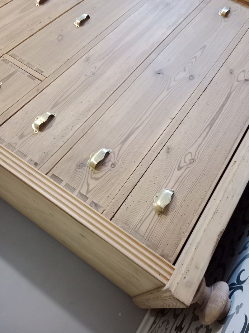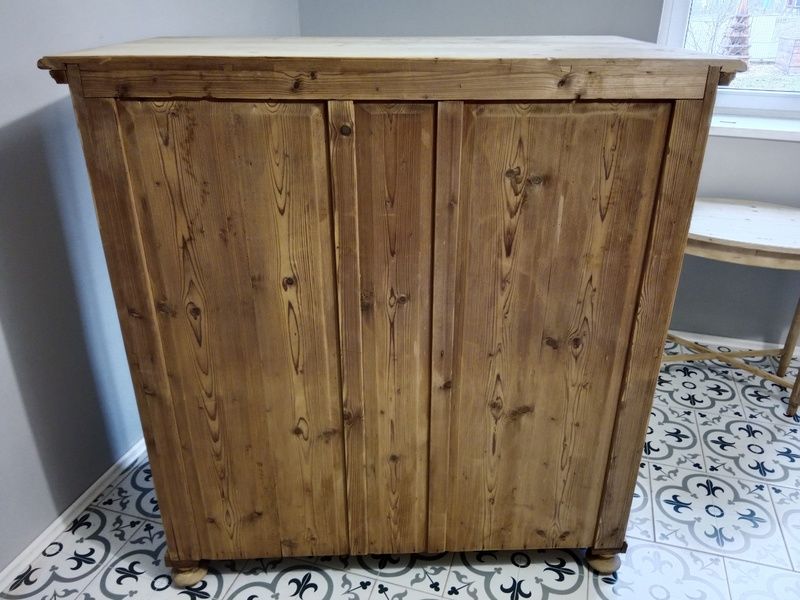 Velký, starý regál po renovaci. Je olouhovaný, obroušený a zatím bez povrchové úpravy čisté dřevo. Rozměry v. 146 cm, deska š. 141 cm * h. 75 cm.