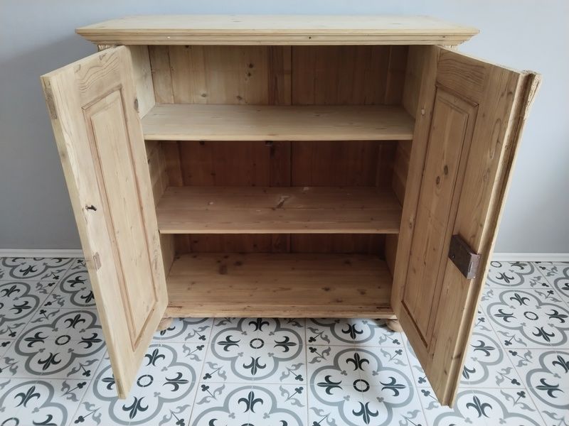 Stará skříňka po renovaci . Je olouhovaná , obroušená a zatím bez povrchové úpravy čisté dřevo.